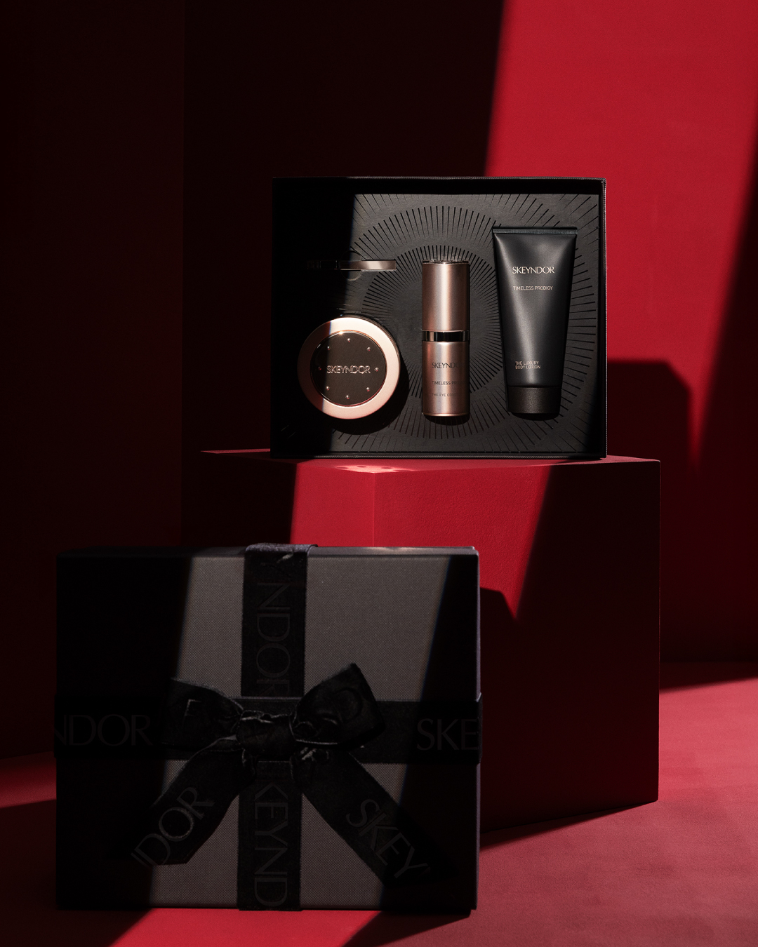 El cofre de Timeless Prodigy es el regalo más premium e ideal que contiene la crema, THE CREAM de 50ml, el contorno de ojos THE EYE CONTOUR de 20 ml y THE LUXURY BODY LOTION un nuevo producto CORPORAL de la línea antiedad total de EDICIÓN LIMITADA para esta Navidad.
