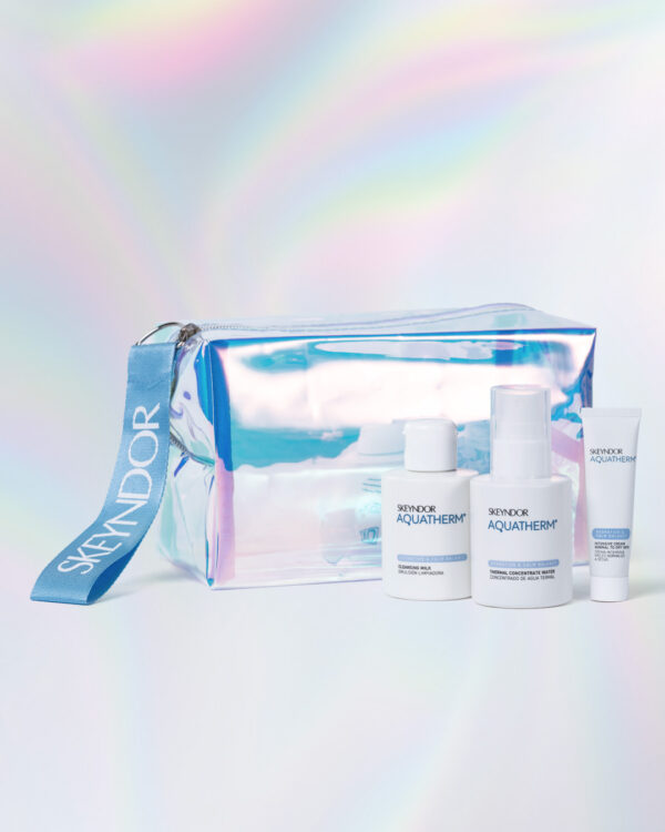 Este kit contiene un moderno y atractivo neceser que contiene el Limpiador Aquatherm de 250ml, leche o gel limpiador en función del tipo de piel, que elimina impurezas respetando la película hidrolipídica. También contiene el Agua Termal de 100ml, una bruma calmante y refrescante que aporta minerales esenciales y alivia la piel al instante. Y finalmente la Crema Calmante de 15ml en un formato especial que hidrata profundamente y calma las rojeces e irritaciones.